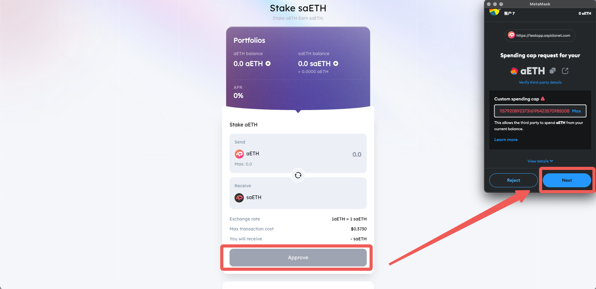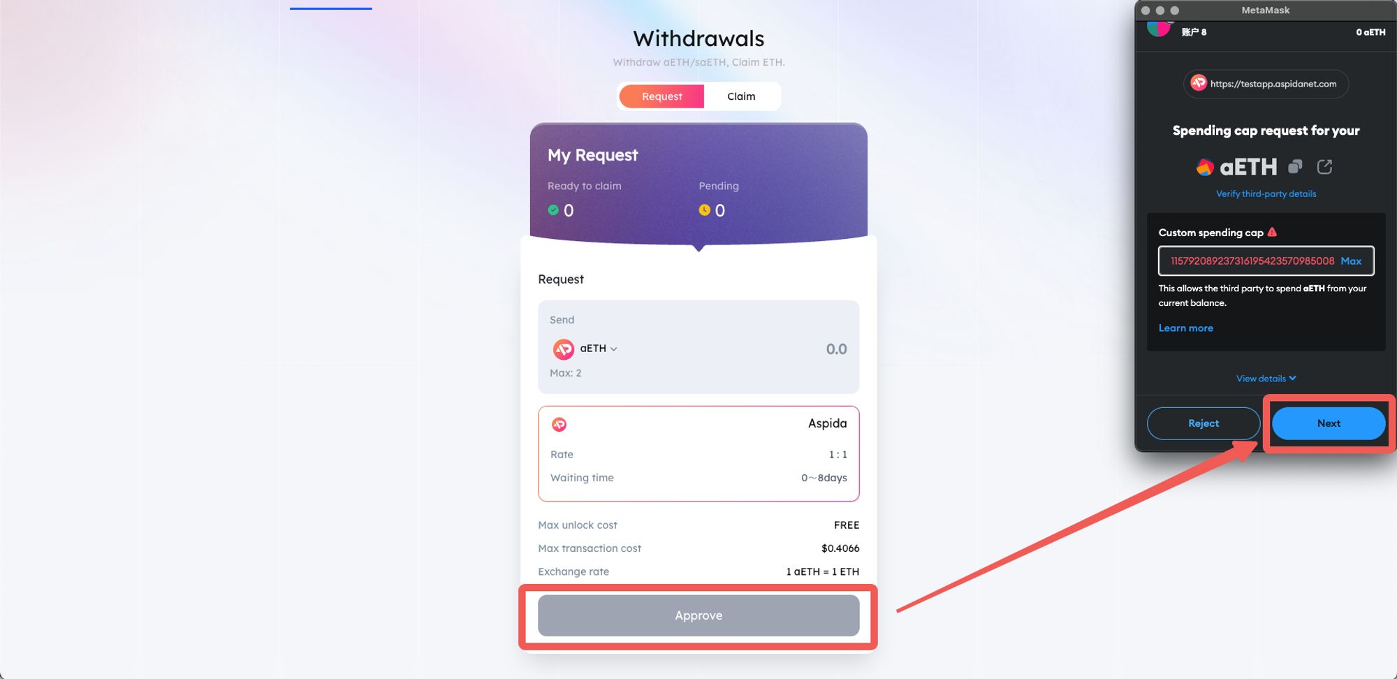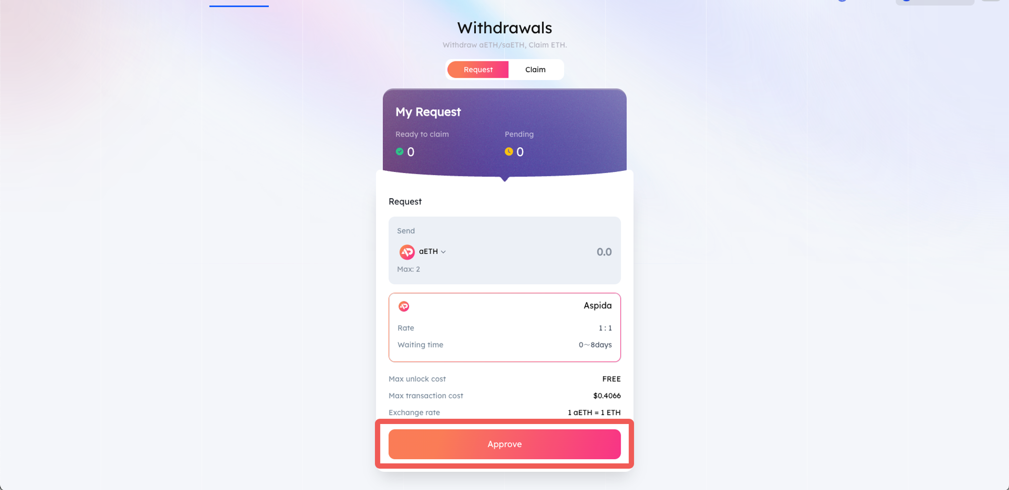 1. You can choose aETH or saETH for withdrawal. Click “Approve” button to request wallet authorization.