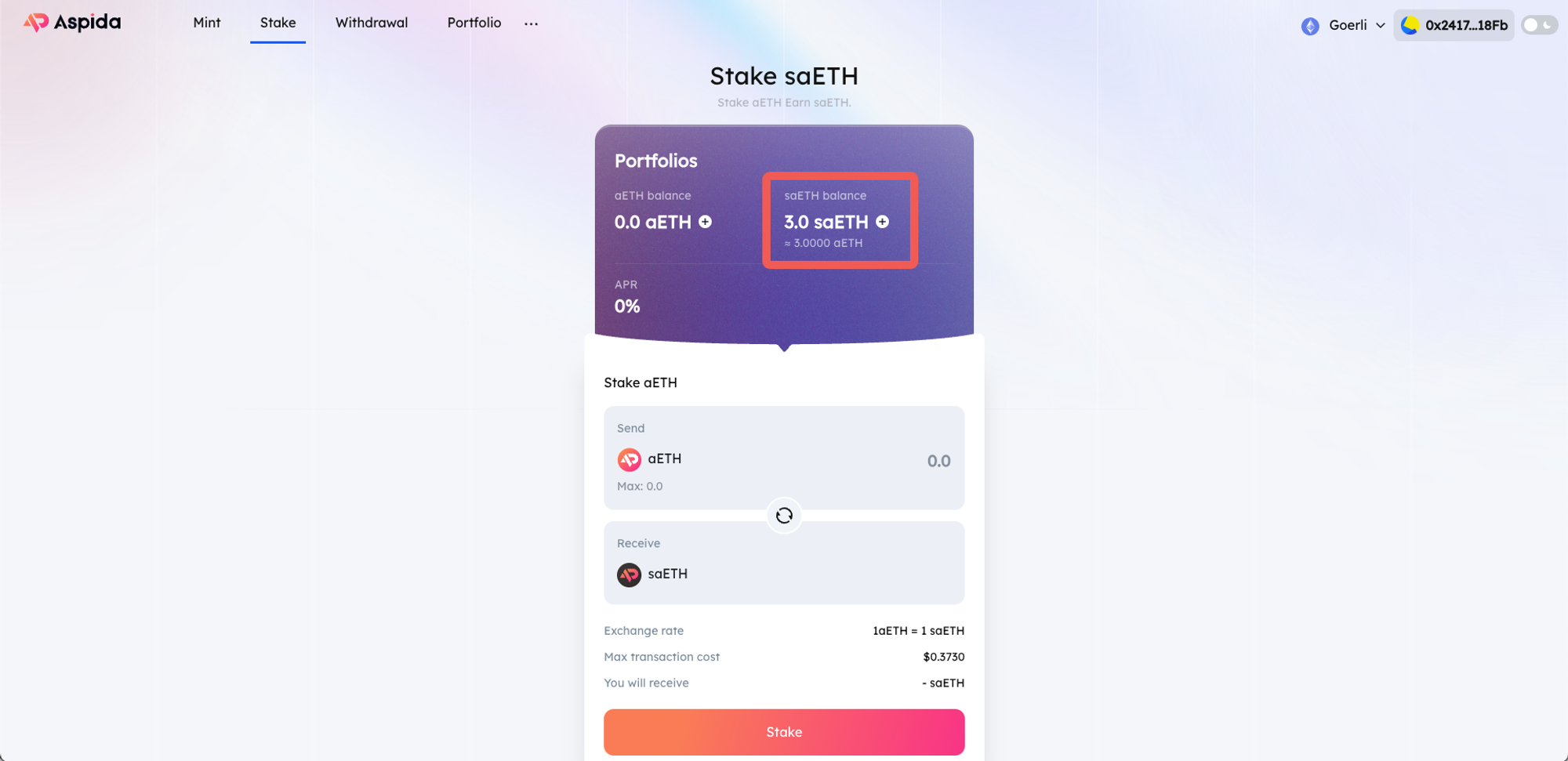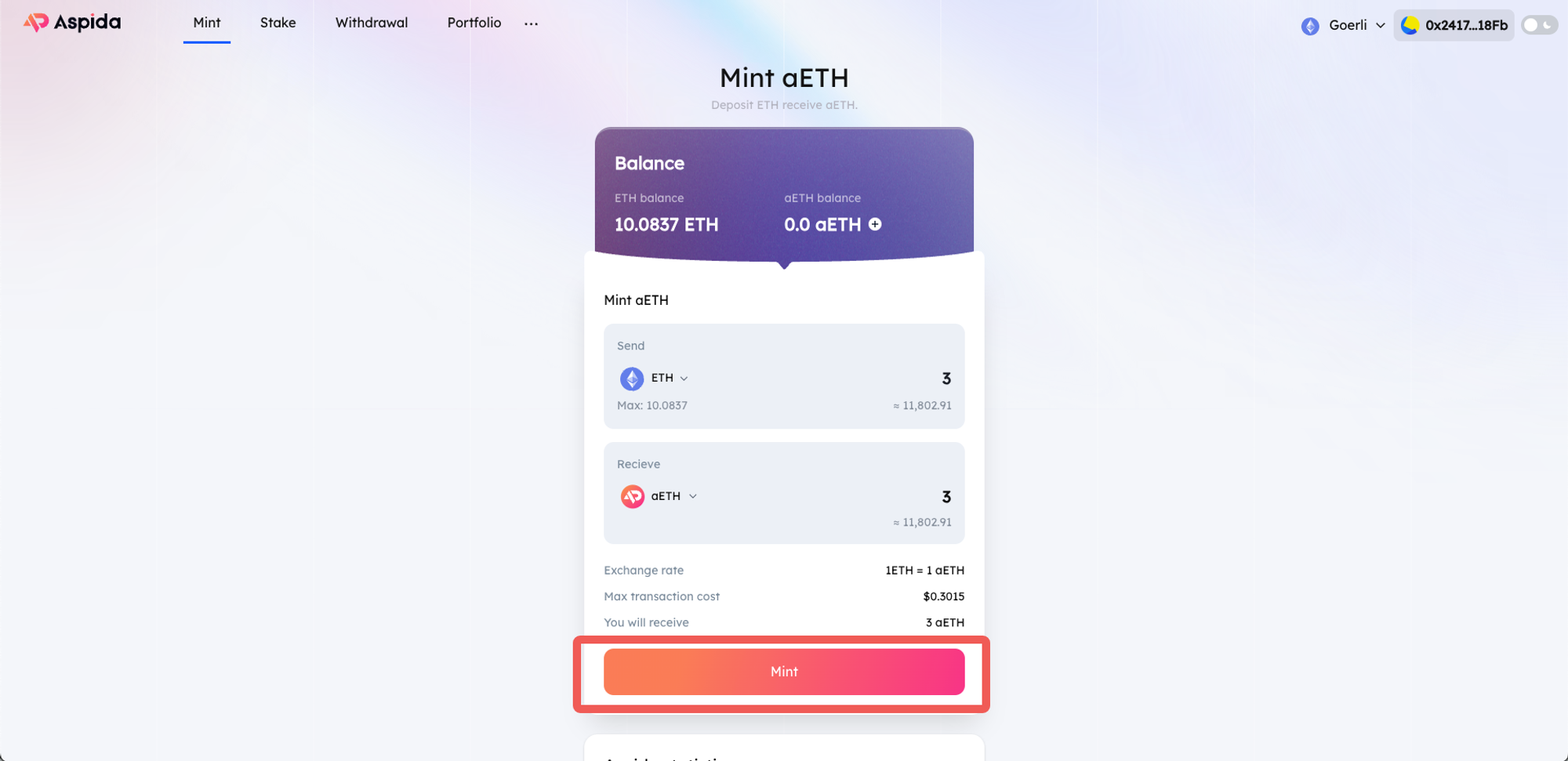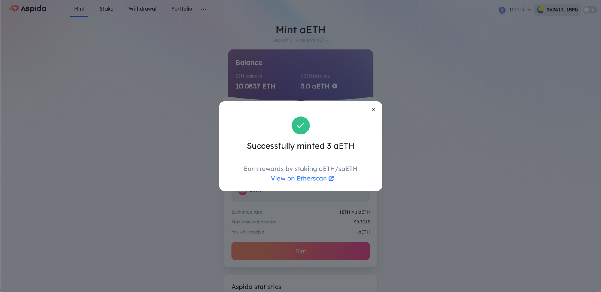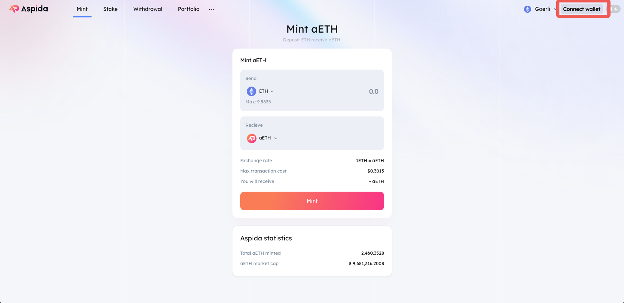 > This tutorial will show you how to use all the core features of Aspida on the Goerli Testnet (Interactions are consistent with the Ethereum mainnet), Connect Your Wallet, Mint aETH, Stake saETH, Withdrawals and Portfolio.