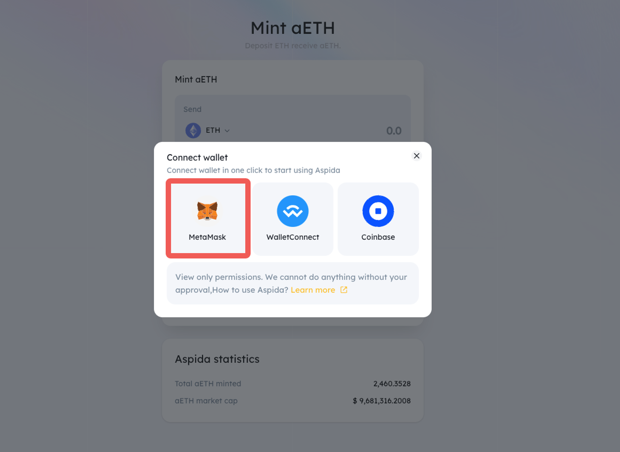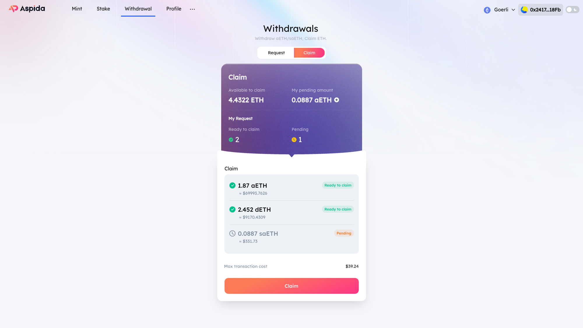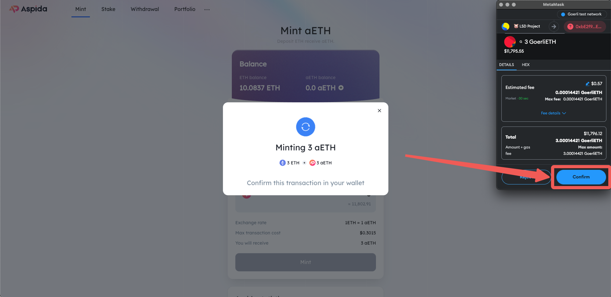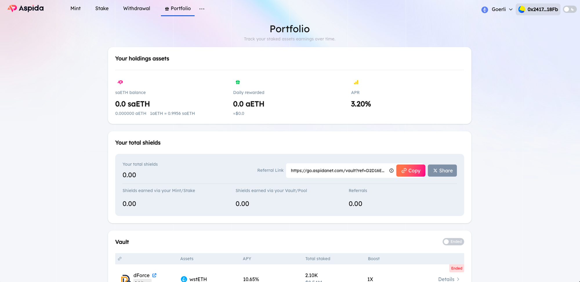 > This tutorial will show you how to use all the core features of Aspida on the Goerli Testnet (Interactions are consistent with the Ethereum mainnet), Connect Your Wallet, Mint aETH, Stake saETH, Withdrawals and Portfolio.