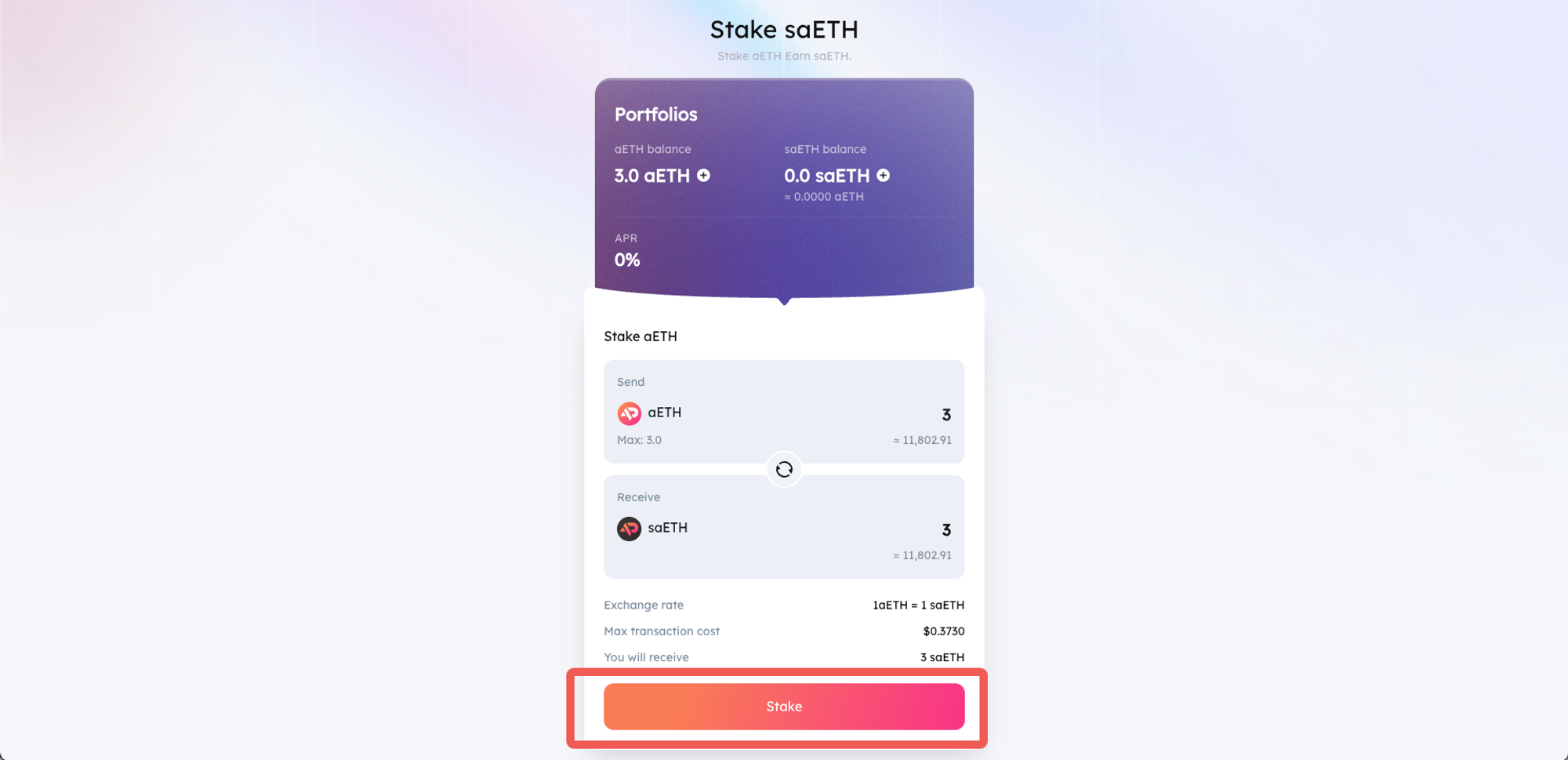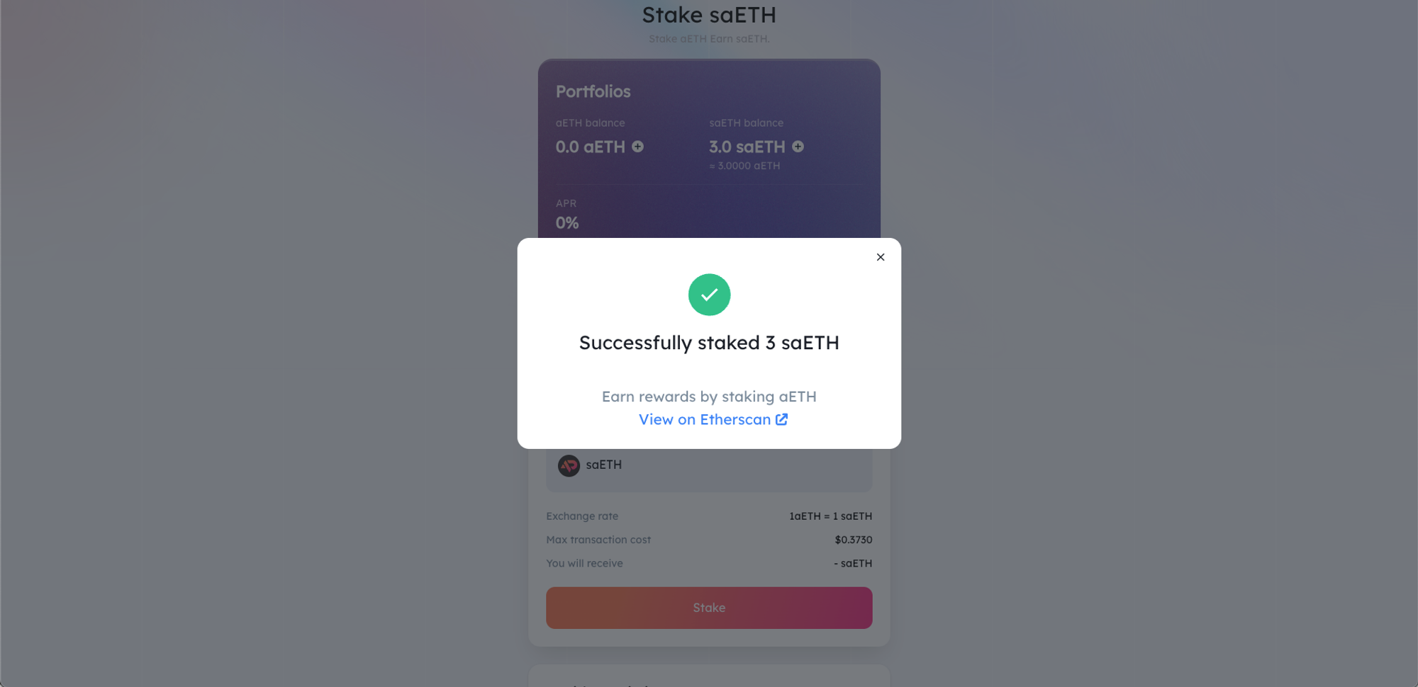 🎉 Congratulations! You've successfully minted aETH . let's proceed to the staking process to earn saETH.