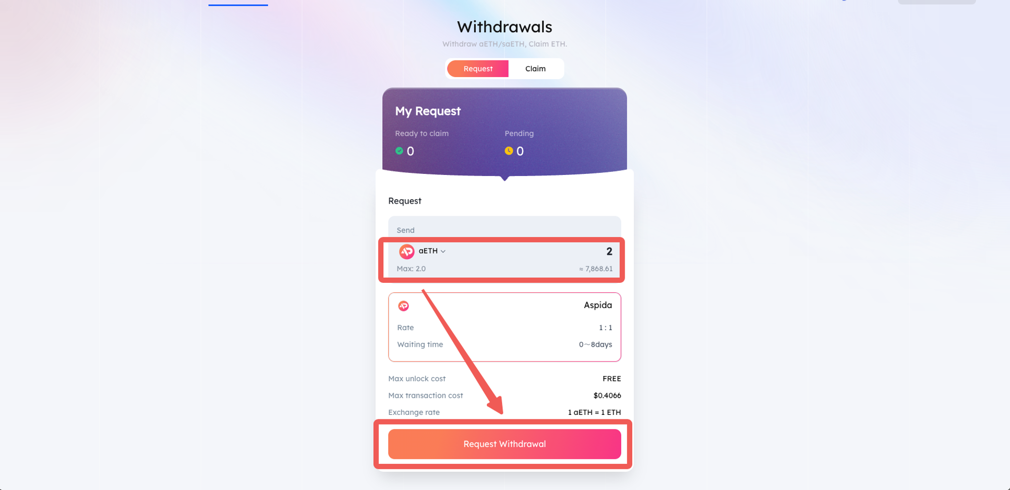 * Enter the amount of aETH you would like to withdrawal, then click the “request withdrawal” button.