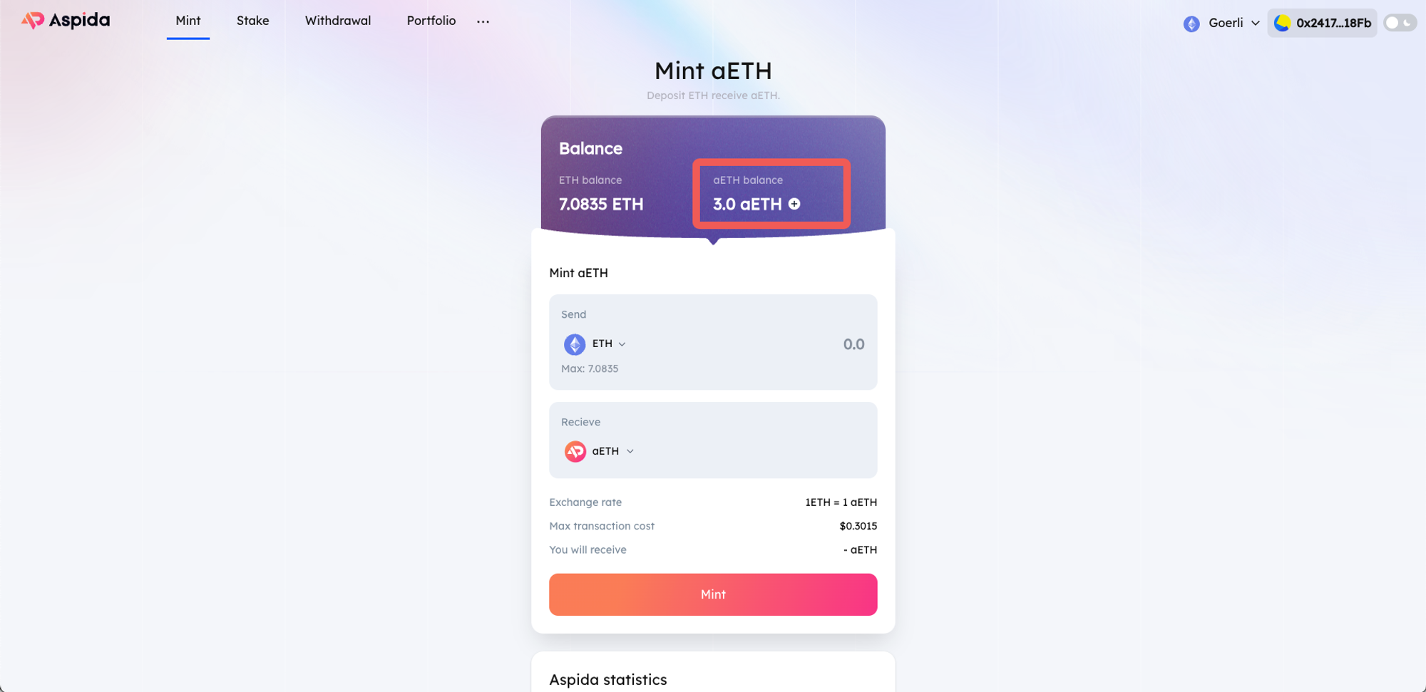 4. ✅ Your minted aETH balance will be displayed on the page (exchange rate: 1ETH = 1aETH).