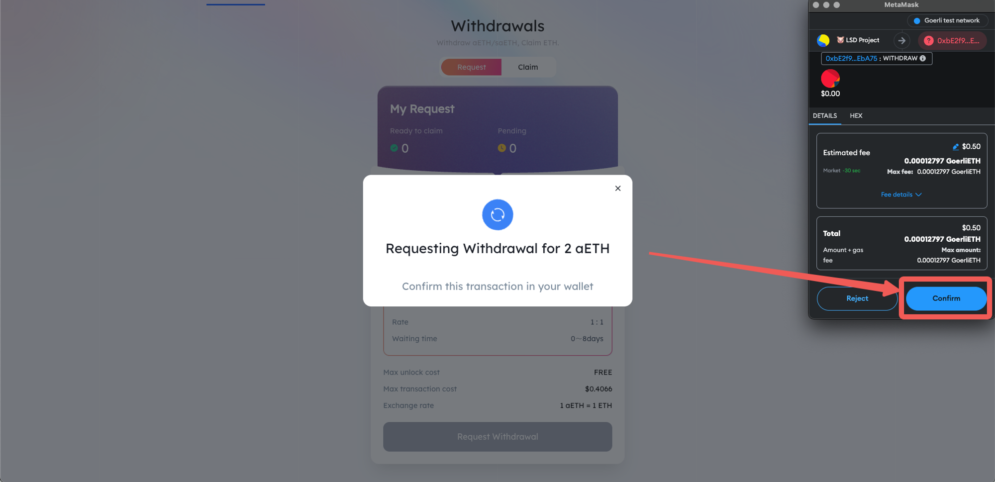 * Click the "Request withdrawal", the DApp will send a request to your connected wallet. Confirm the transaction to execute the withdrawal process.