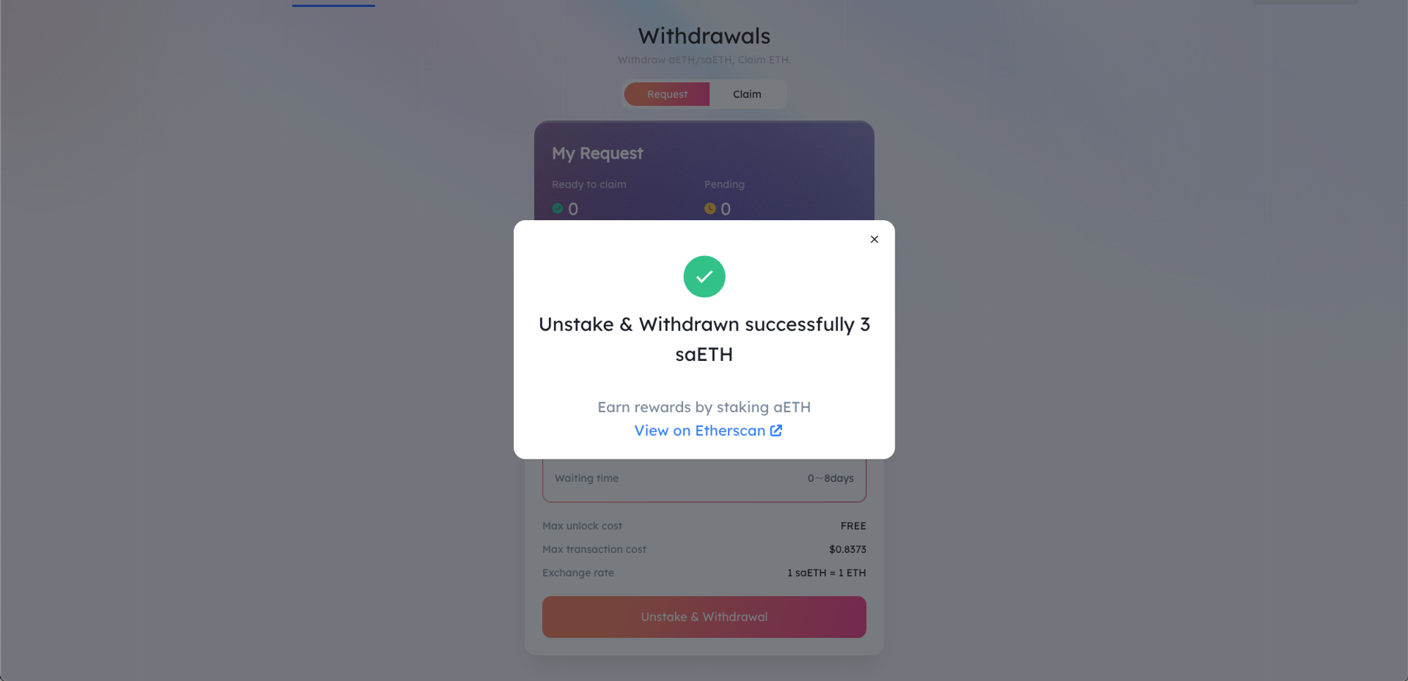 > Click the "Switch" button to switch saETH → aETH. then click on "Unstake" button. TA transaction prompt will appear in your wallet. You‘ll get unstaked amount . Click "View on Ethereum" to verify transaction details.