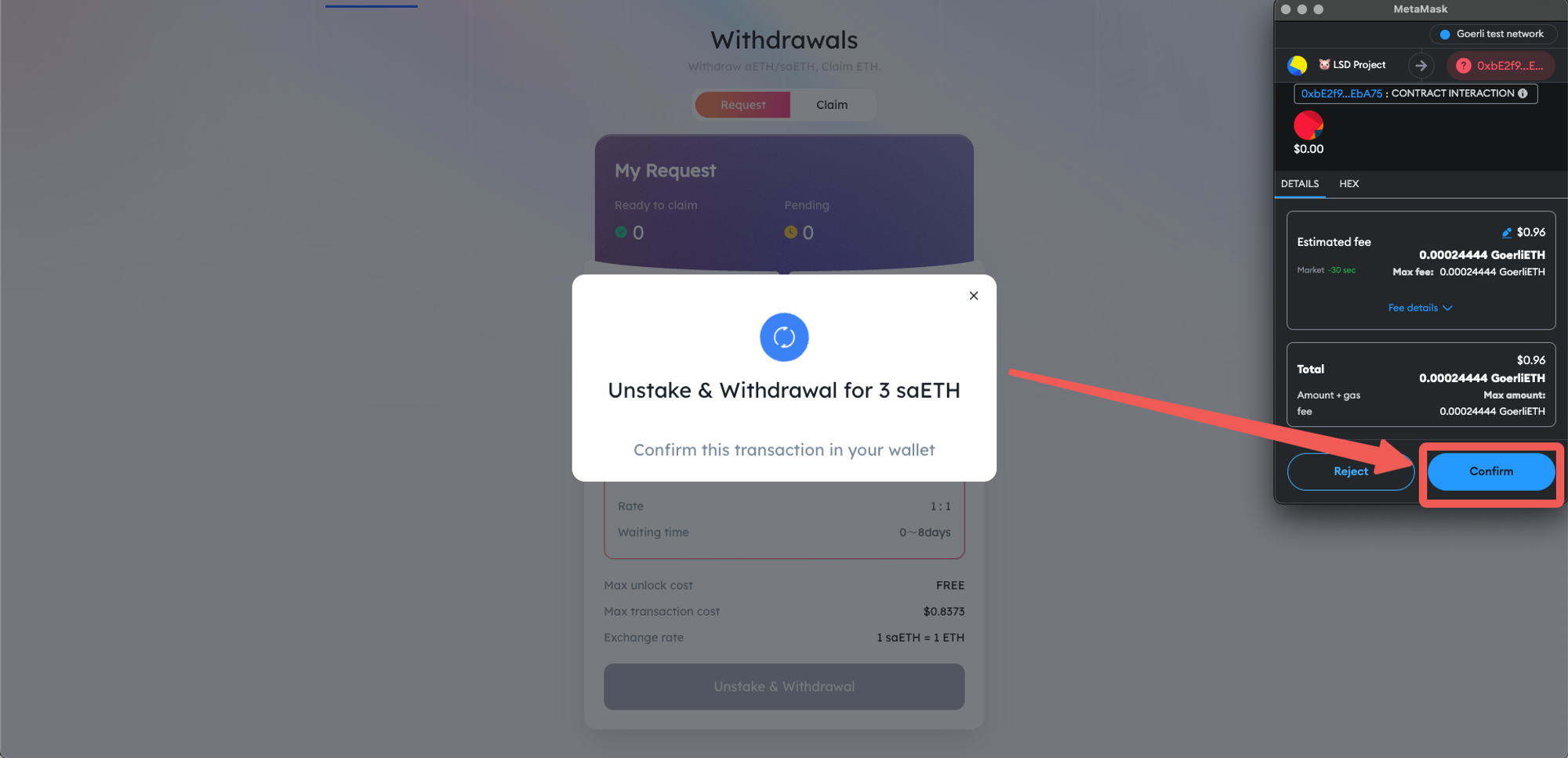 * Enter the amount of saETH you would like to “Unstake & Withdrawal”, then click the “request withdrawal” button.