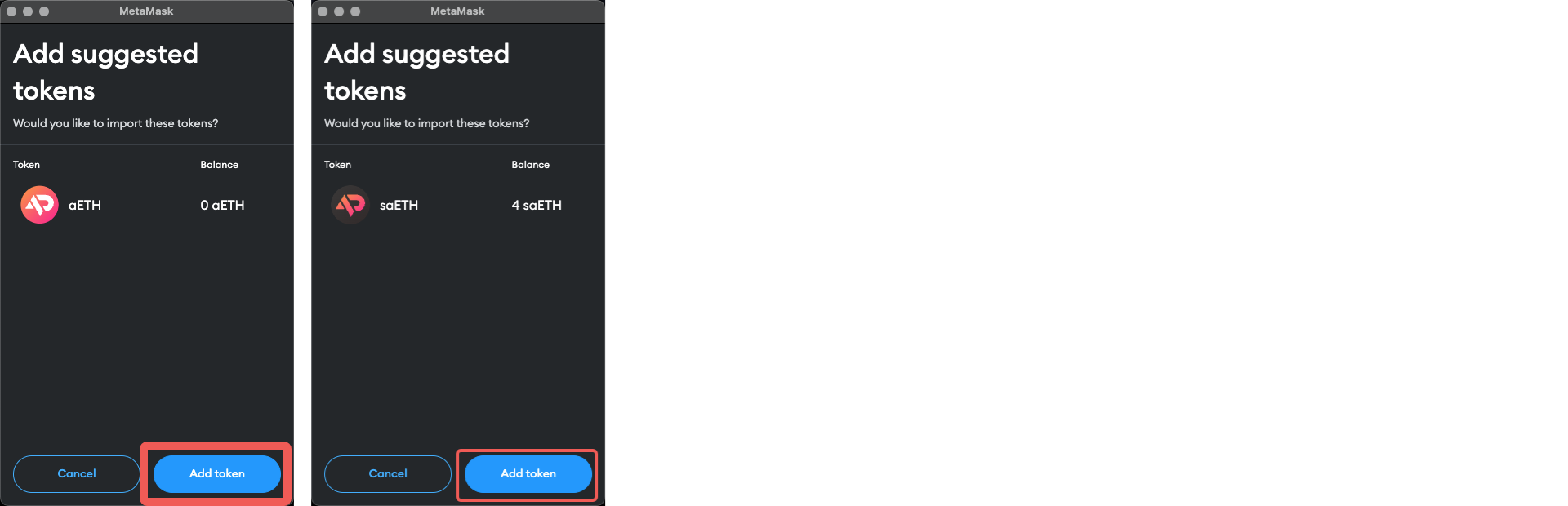 1. First you need to add aETH and saETH token to wallet. Click the "Add Tokens to Wallet" and request the wallet to execute the "Add Token" operation.